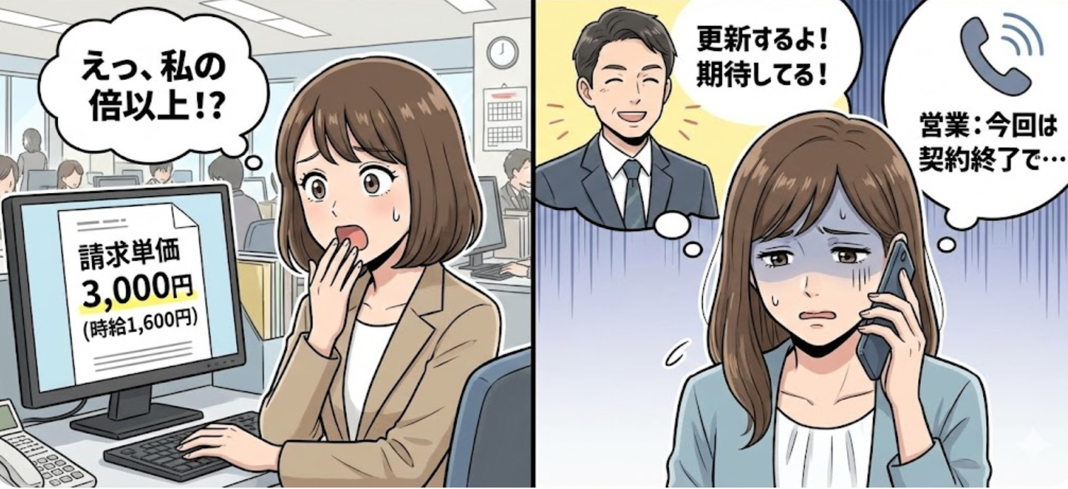 「えっ、私の時給は1,600円なのに、会社には3,000円も請求してるの!?」 「ピンハネしすぎじゃない!?交渉だ!」