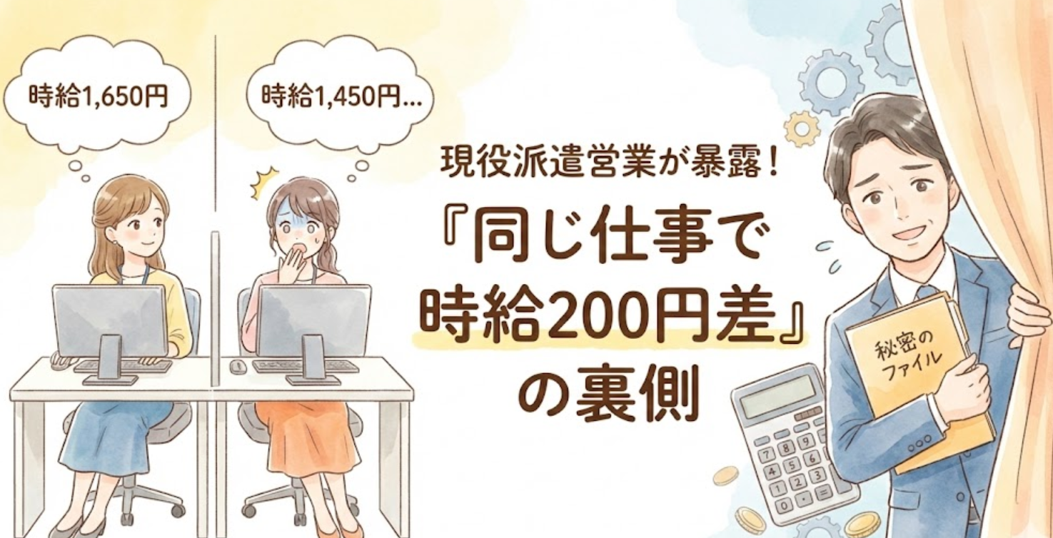休憩室でこんな会話を耳にして、血の気が引いたことはありませんか? 全く同じオフィス、全く同じ仕事内容、座席も隣同士。なのに、派遣会社が違うだけで時給が200円も違う。 月収に換算すると、約3万2千円もの差。年間なら約40万円です。 これ、知らなかったでは済まされない金額ですよね。