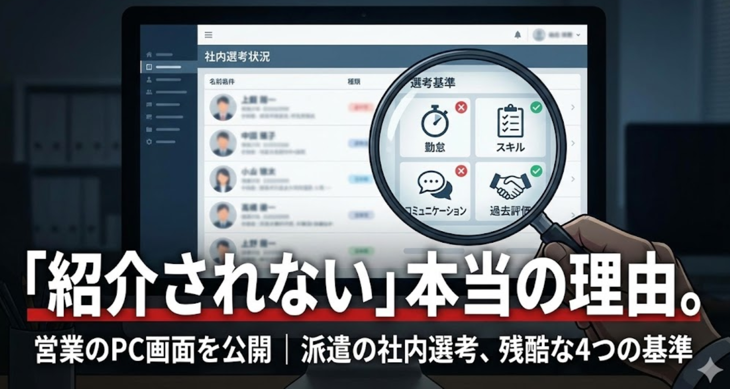 実は、この「紹介されない理由」の9割は、皆さんが思っているような「能力不足」ではありません。 今回は、私たち派遣営業やコーディネーターが、応募者のリストを見ながら裏でどのような会話をし、どうやって「たった1人の候補者」を決めているのか、そのブラックボックスを開けます。